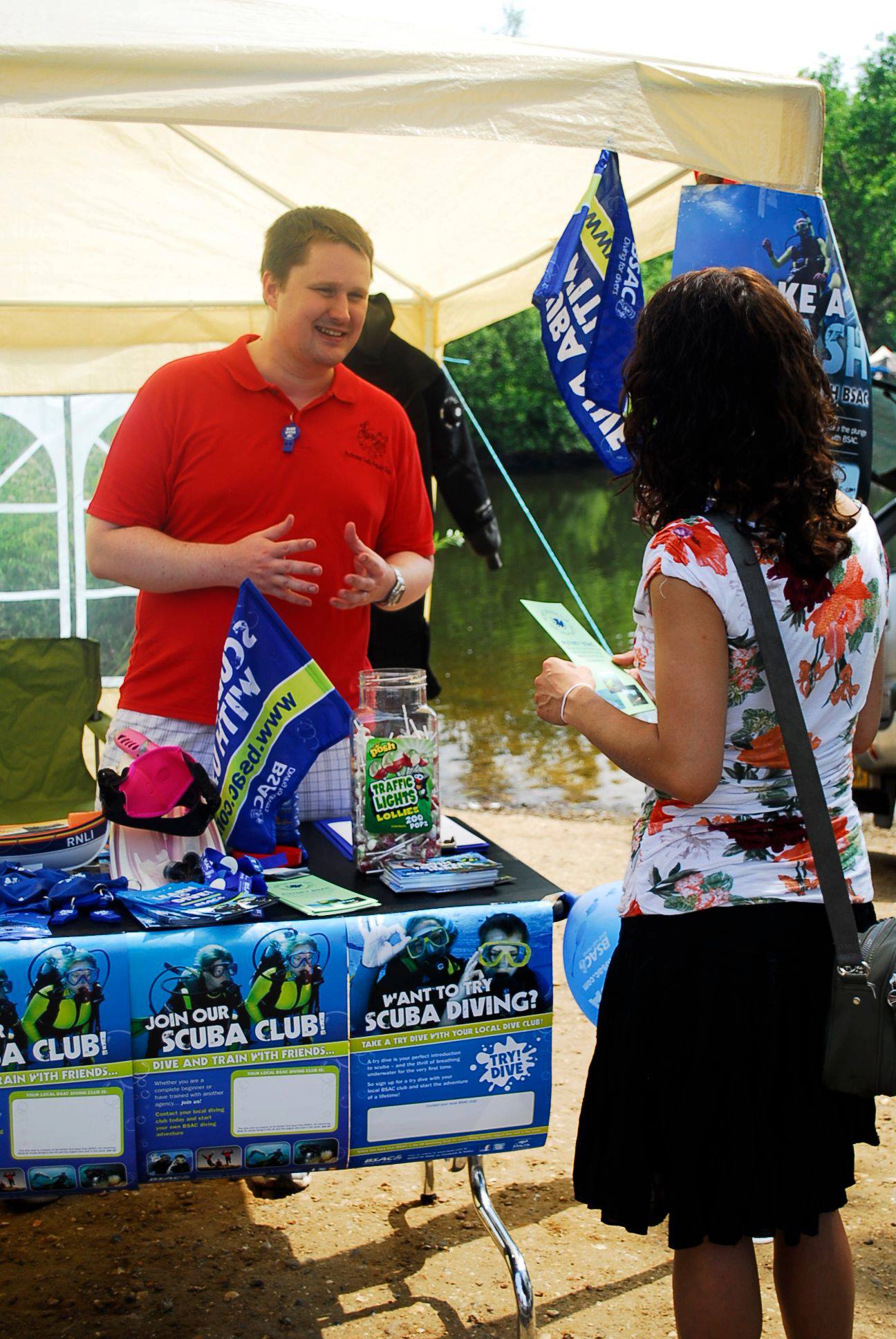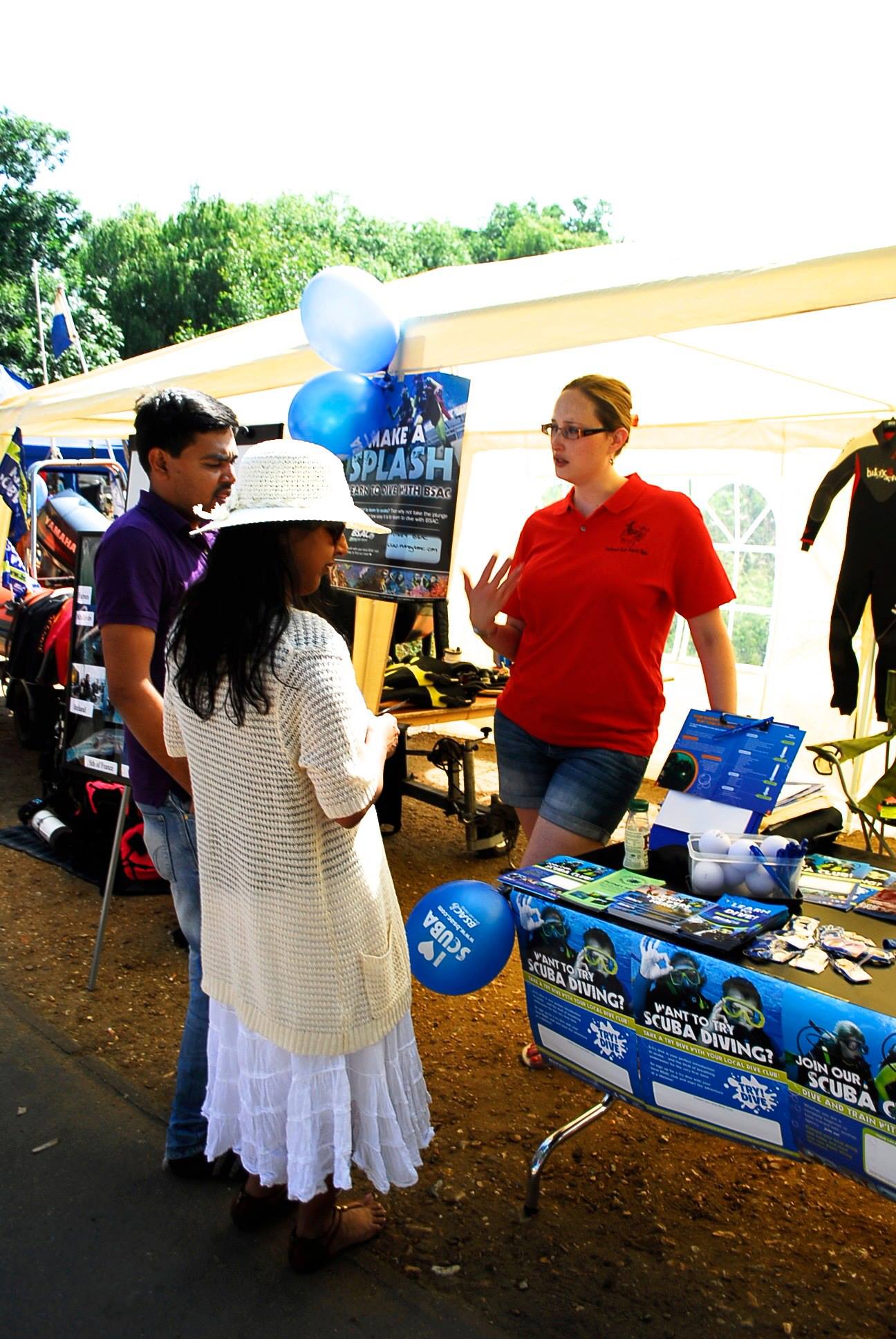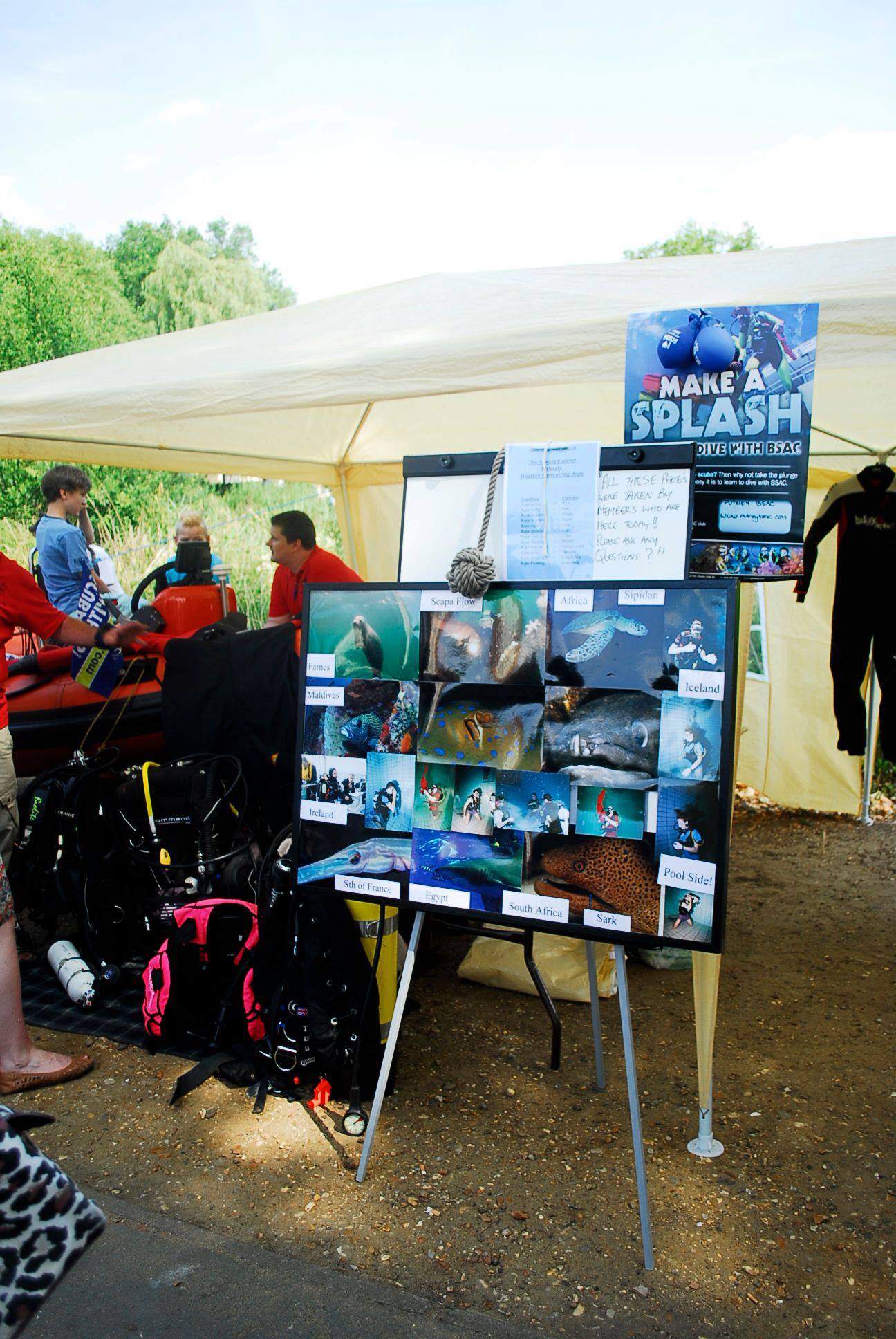 As luck would have it, the area that we were given as our patch, was on the edge of the pond, and was a little out of the way from the rest of the festival….this proved to be a bit of a god send, as we were able to spread out and accommodate our entire display wonderfully! With the help from BSAC HQ, we were able to embellish our stand with BSAC flags and banners, and give out freebie items to our visitors, which went down very well indeed. We were inundated with enquiries from a number of source, such as…..lapsed BSAC members, PADI divers who were interested in taking up the sport more seriously..(we gently pointed out the difference between PADI and BSAC ) and gave due respect to both agencies. We were also approached by a D.O from another BSAC branch that was folding due to lack of numbers, and were looking out for a local BSAC club to regroup and join up with…so all in all a very successful and promising day.